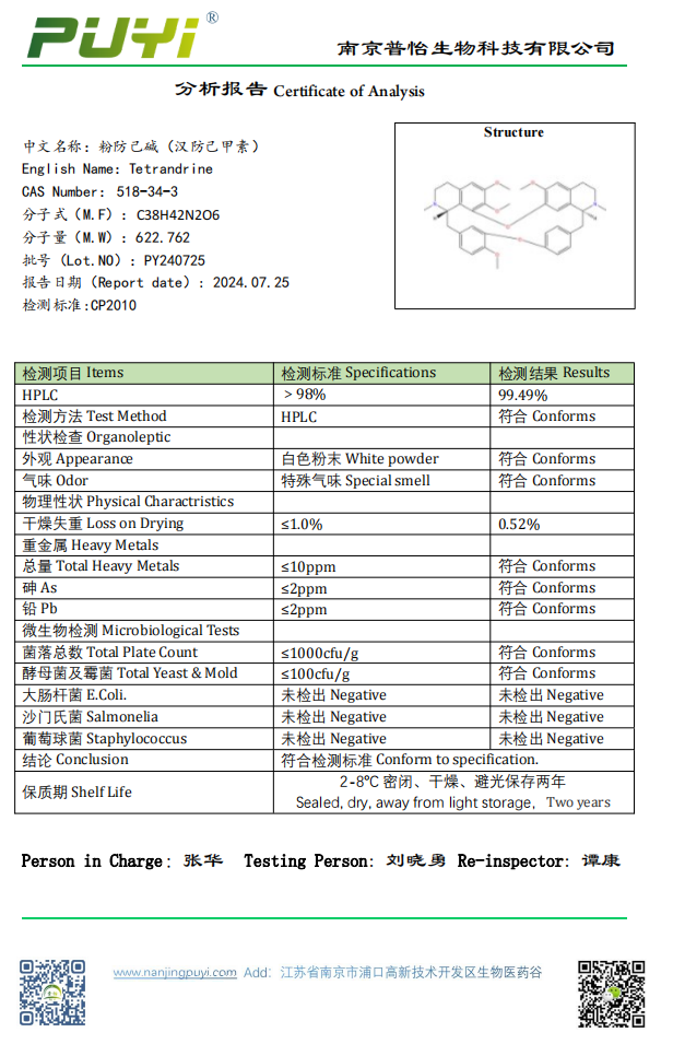 英文別名:Tetrandrine;(+)-Tetrandrine;Berbaman, 6,6',7,12-tetramethoxy-2,2'-dimethyl-, (1beta)-;D-Tetrandrine;Tetrandrin;6,6',7,12-Tetramethoxy-2,2'-dimethyl-1-beta-berbaman;(S,S)-(+)-Tetrandrine;(S.S)-(+)-Tetrandrine;TETRANDRINE(P);TETRANDRINE, (S,S)-(+)-(RG);(1β)-6,6',7,12-Tetramethoxy-2,2'-dimethylberbaman;6,6',7,12-tetramethoxy-2,2'-dimethyl-berbaman;Conba;fanchinine;hanfangchin A;Jinake;sinomeninea;Trandrine;[ "" ]